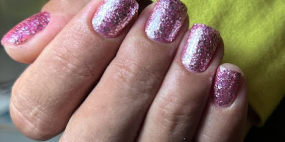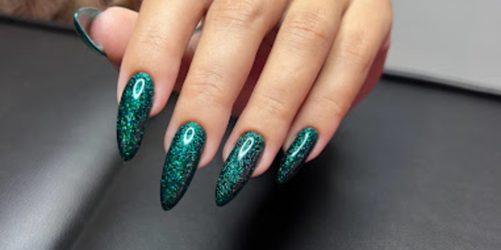 Creative nail art including ombre, chrome, glitter, and 3D designs
